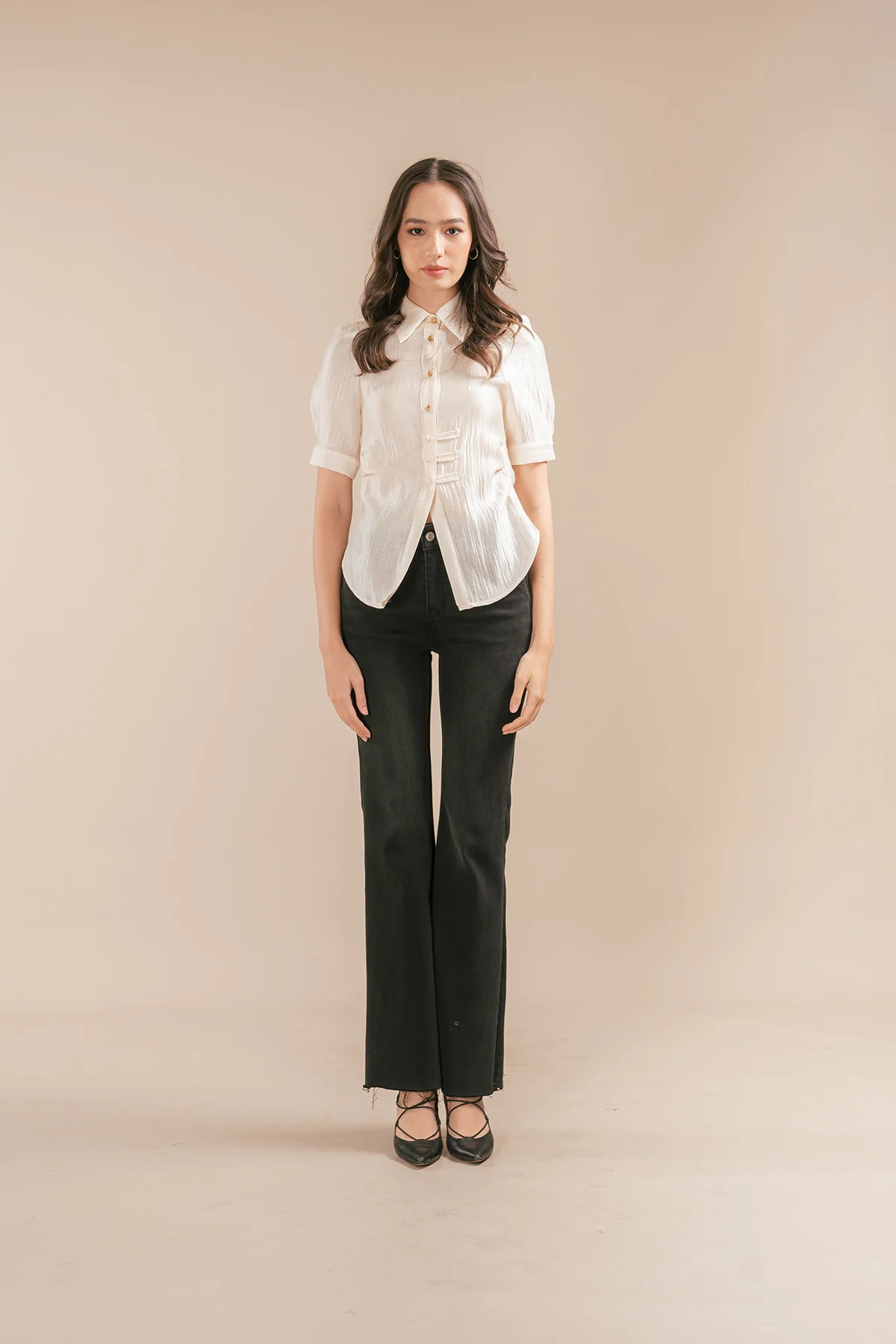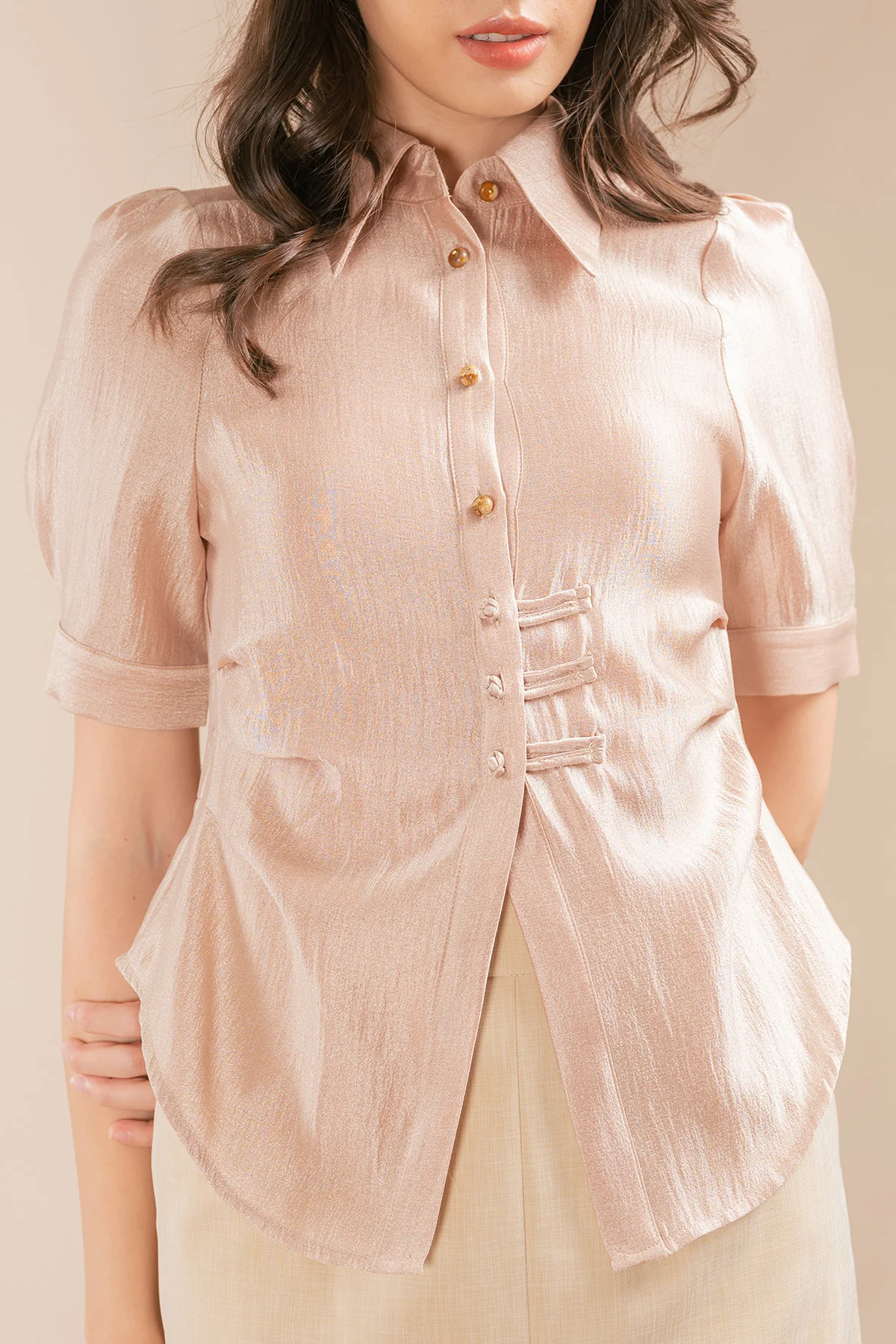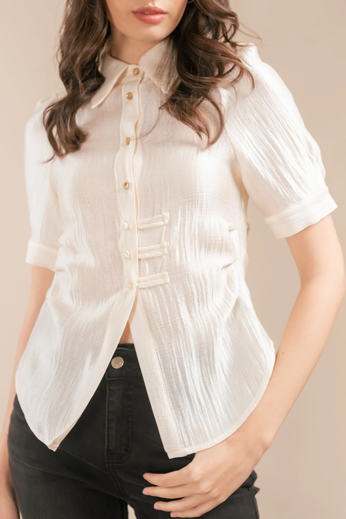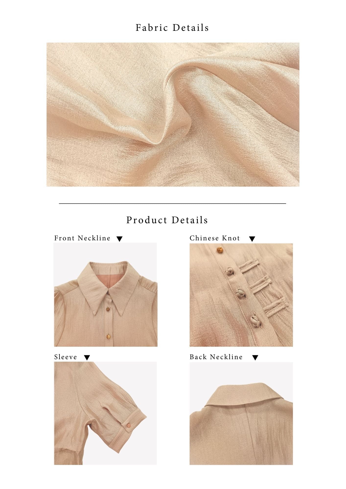 This Shuyue Chinese Knot Ruched Shirt is a luxurious and exclusive piece that exudes elegance. Made from shiny textured fabric, it features a shirt collar neckline and short puff sleeves with buttoned cuffs. The front buttons and unique Chinese knot buttons fastening add a touch of sophistication, while the ruched design at both sides and curved hemline create a flattering silhouette.