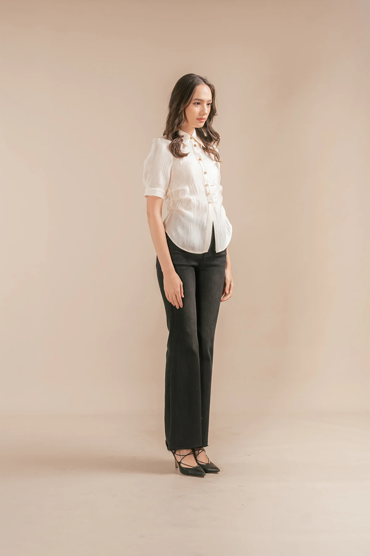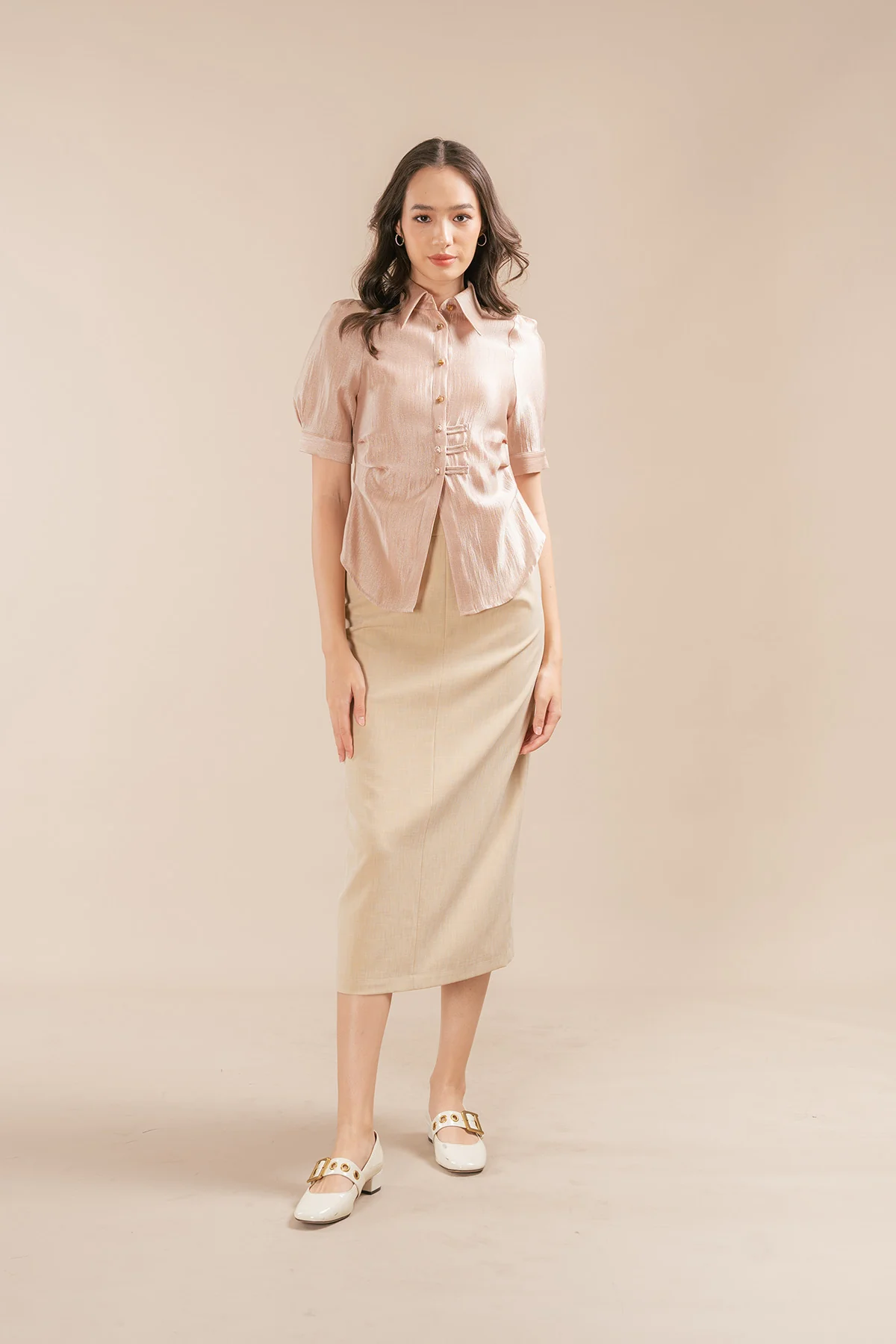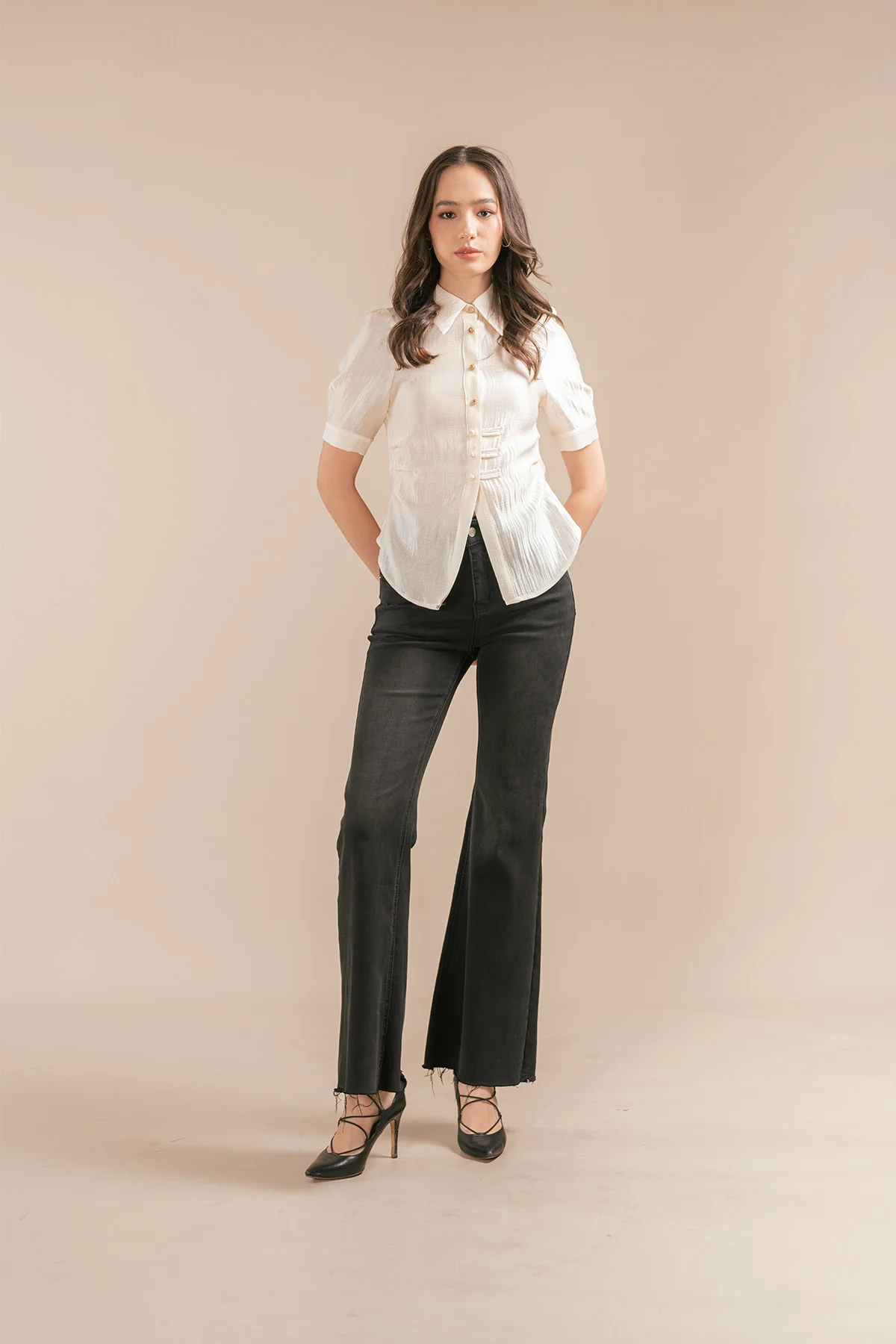 This Shuyue Chinese Knot Ruched Shirt is a luxurious and exclusive piece that exudes elegance. Made from shiny textured fabric, it features a shirt collar neckline and short puff sleeves with buttoned cuffs. The front buttons and unique Chinese knot buttons fastening add a touch of sophistication, while the ruched design at both sides and curved hemline create a flattering silhouette.