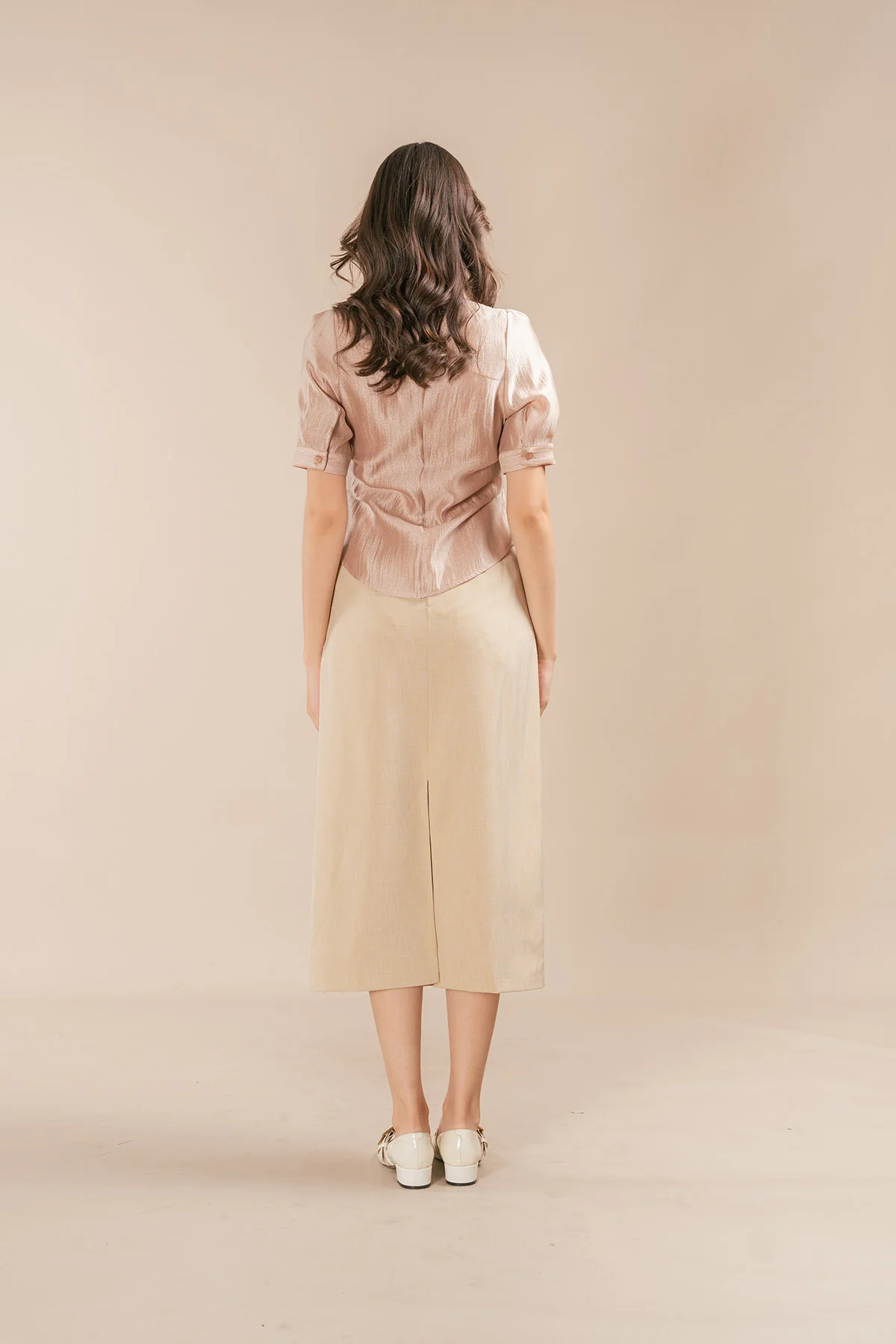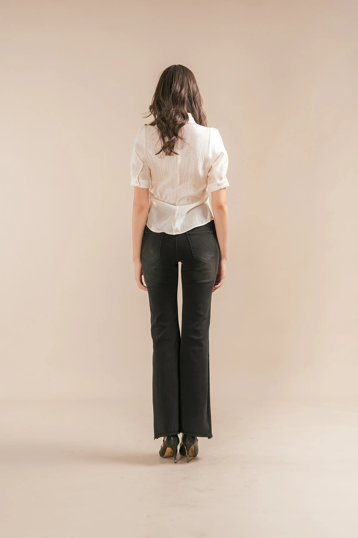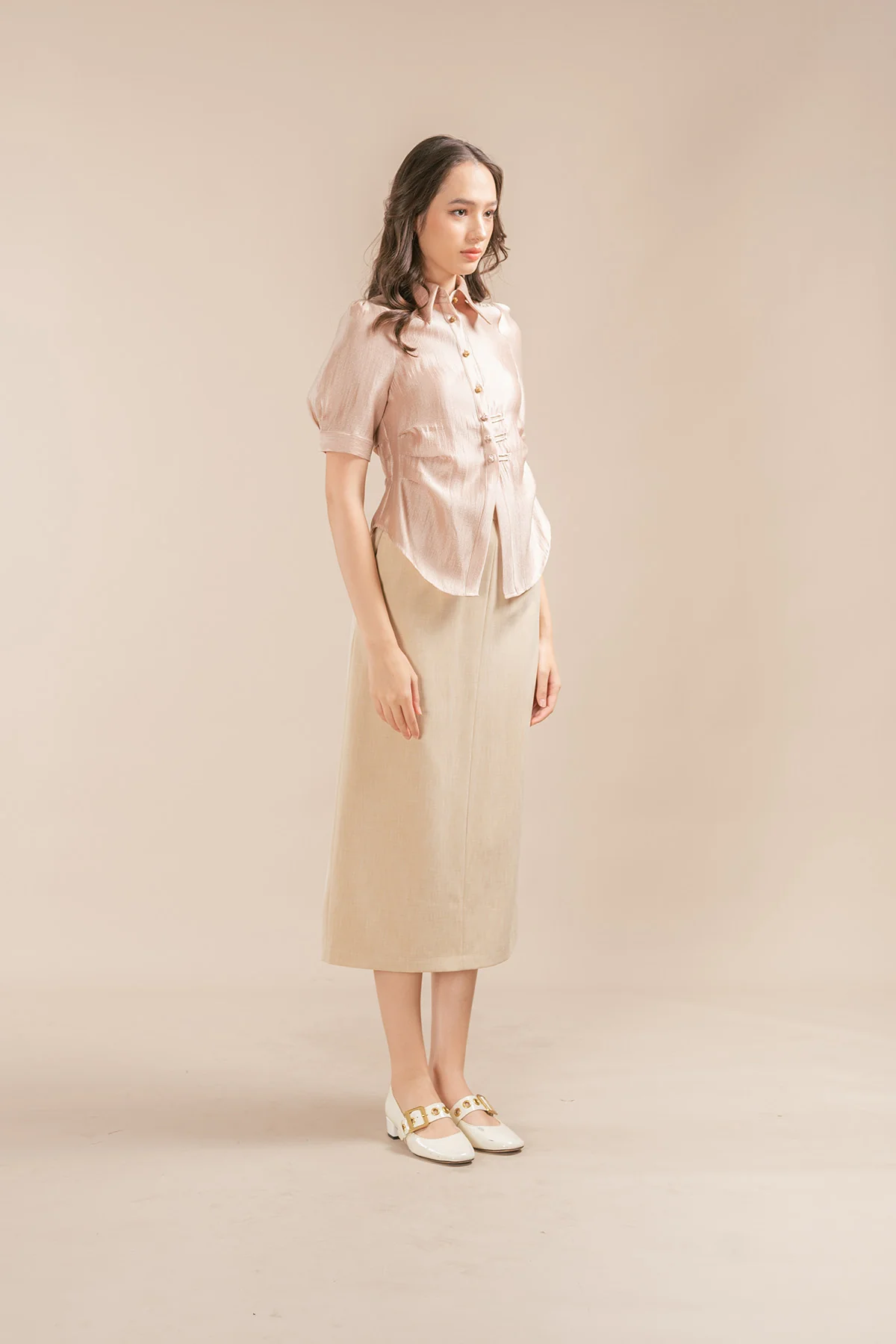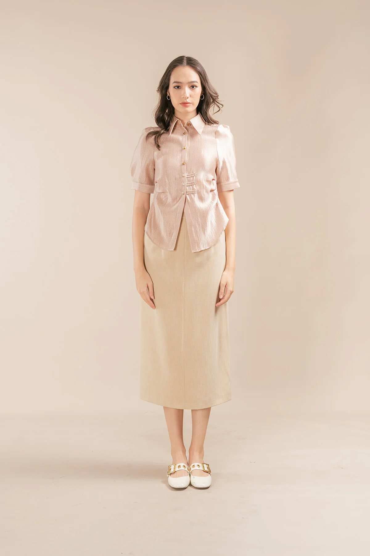 This Shuyue Chinese Knot Ruched Shirt is a luxurious and exclusive piece that exudes elegance. Made from shiny textured fabric, it features a shirt collar neckline and short puff sleeves with buttoned cuffs. The front buttons and unique Chinese knot buttons fastening add a touch of sophistication, while the ruched design at both sides and curved hemline create a flattering silhouette.